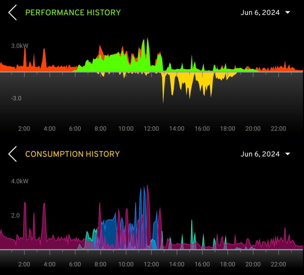During the day in summer most solar PV installations are producing a good amount of power. Much of this power would be exported on to the local electricity grid (sometimes this exported power is called “excess generation”). Exporting excess power may also happen in an installation with a home battery when either the battery is fully charged or if the power produced is more than the battery can store at that time.