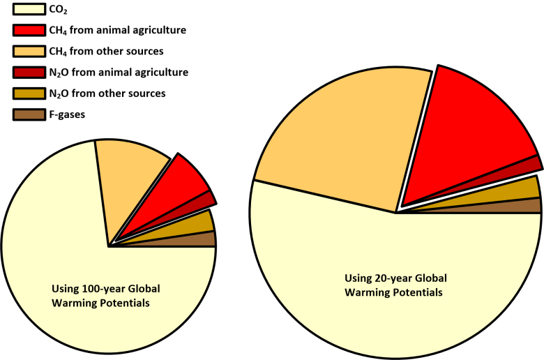 The amount of methane and carbon dioxide emitted from different human activities is fairly well understood and the concentration of these gases in the atmosphere is very carefully measured. Comparing the effect of methane emissions to carbon dioxide emissions is not straightforward due to the shorter time methane persists in the atmosphere before it breaks down producing carbon dioxide. Methane traps many times more heat than carbon dioxide. So comparisons must consider a timespan over which the warming effect is calculated. The convention in most climate science is to make the comparison over a 100-year window: comparing the average warming potential of methane over 100 years (during which time it has broken down into carbon dioxide) with that of carbon dioxide over the same 100 years. However, with the emphasis on reduction of global warming in the shorter term to meet 2050 goals (and to reduce the accelerated increase in atmospheric concentrations to reduce the risk of inducing or triggering climate tipping points such as methane release from melting permafrost), an increasing number of commentators are preferring to use the 20-year equivalence window which attributes larger short-term warming effects to methane than when using the 100-year comparisons.