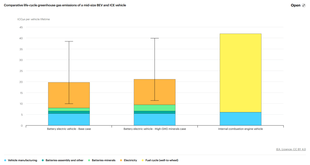 | Category | IEA battery electric vehicle base case (tCO2e) | IEA battery electric vehicle high emissions case (tCO2e) | IEA conventional vehicle case (tCO2e) |