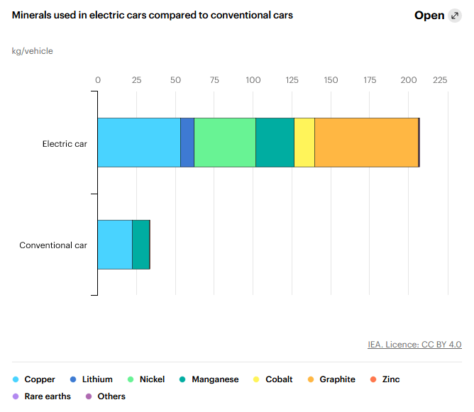It is well known that there are significantly more expensive minerals used in electric vehicles than in petrol or diesel vehicles and that they are mainly used in the battery. The IEA (International Energy Agency) has explored this in a report on critical minerals.
