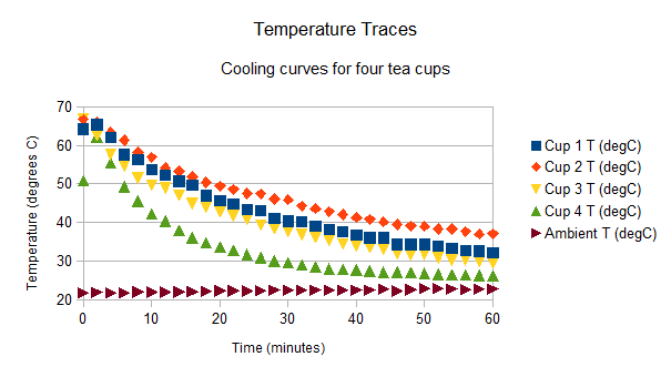After 20 minutes we can see that hottest to coldest is Cup #2, Cup #1, Cup #3 and Cup #4. In fact we can see that this order is maintained right to the end of the experiment. The hottest cup was that insulated with a dry tea towel. The second hottest cup was our control cup (our normal cup of tea). In third place was the cup insulated with a soaking wet tea towel and the coldest cup was that immersed in a cold water bath.