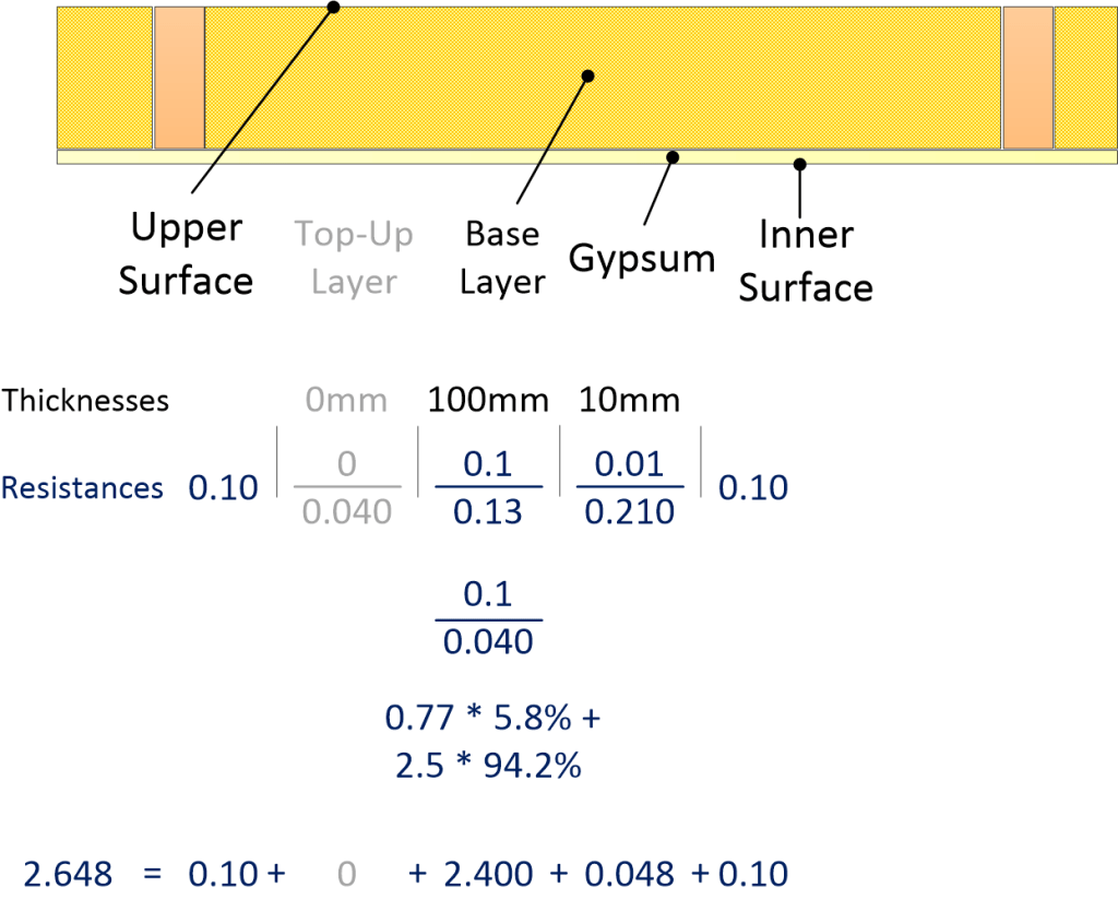 The effect on the thermal resistance is a change from 2.648 to 6.398 – so the U-value reduces from 0.38 to 0.16. That’s why topping up the loft insulation is such a good idea.