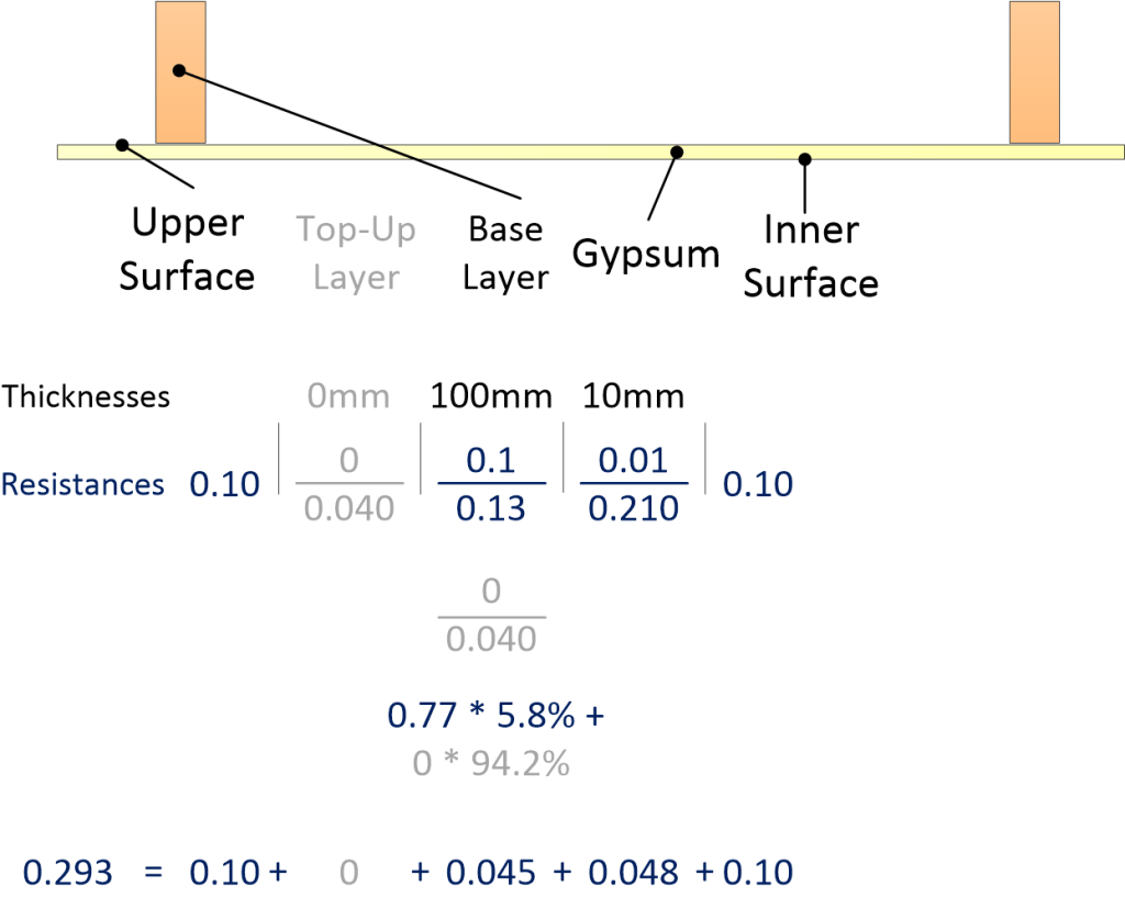 This example has only a single layer of glass wool between the wooden joists (the joists are assumed to be 35 mm wide and are spaced apart by 600 mm so that the area fraction for the timber is 35/600 or 5.8%). The upper surface resistance is not for an exposed surface because there is a ventilated roof structure above it. The thermal resistance here is 2.648 giving a U-value of 0.38.