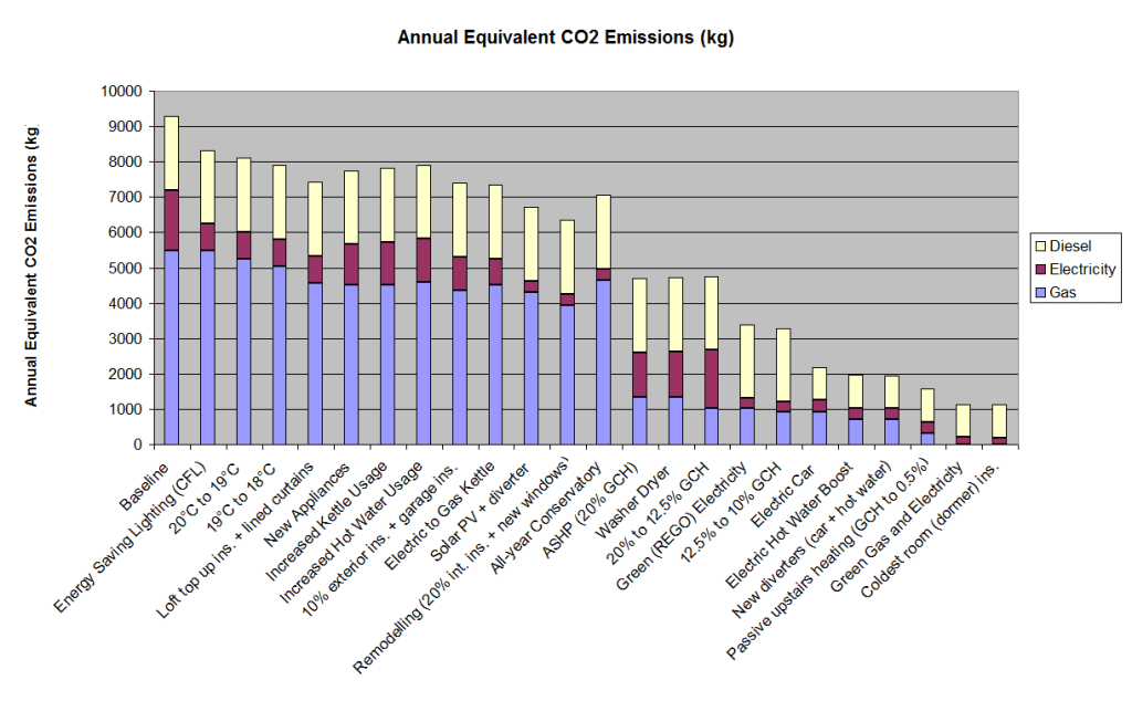 I live in a relatively small 3 bedroom detached house built in the late 1990s. Like many UK properties it had relatively poor insulation, basic double glazing, gas central heating. It was pretty much as it was built by the original builders. The family car was a small turbo-diesel with low annual mileage.