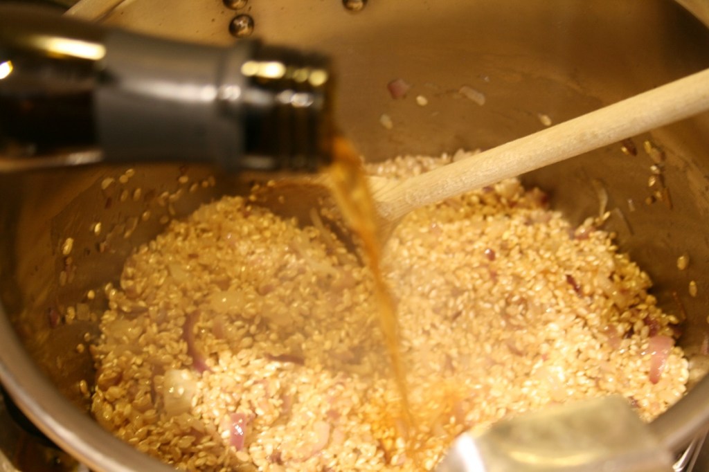 - After a few minutes pour in the Marsala or white wine. For this dish a slightly sweet or fortified wine like Marsala works well so you could use Moscato instead or simply a white wine. The rice will give you a fizz or hiss of satisfaction as it combines.