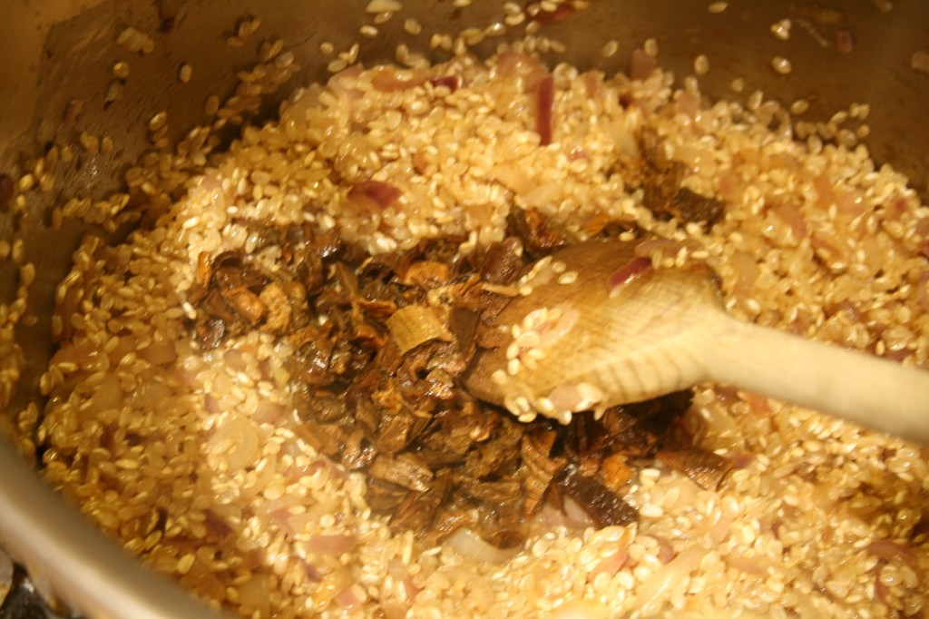 It being autumn we will use porcini mushrooms to allow us to give a fantastic flavour so that it can be really amazing and meat-free. I love the nuttyness that comes with using Italian short grain brown rice (riso integrale). It takes longer to cook but it is worth the extra time! The recipe works well with a good white risotto rice such as arborio, carnaroli or vialone nano too.