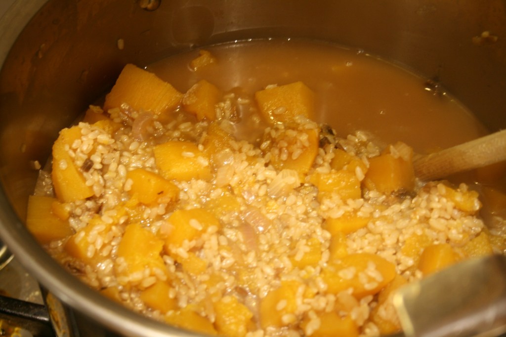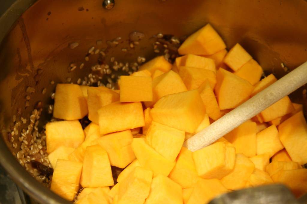 - As the water is evaporating off then add some boiling water to cover the rice and add in the coarse cut pumpkin