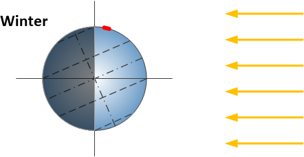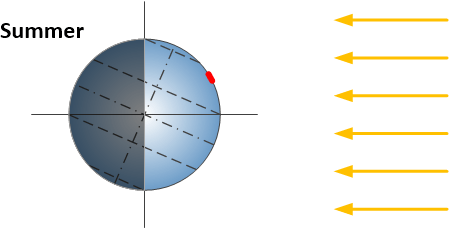 We can then look at the Sun shining on the earth when we are at maximum tilt in midsummer and midwinter. As the Earth spins we can see how the day is longer/shorter and at midday solar time we have the sun higher/lower in the sky.