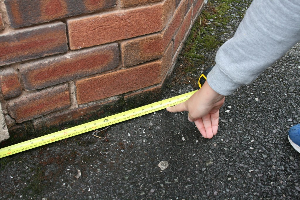 It is recommended to measure five bricks across a number of times on the building in question to get an average brick width (taking into account the mortar thickness) for this building. Repeat this with ten bricks up to get an average brick height for the building. Now when you count bricks you are also measuring lengths and heights! Just don’t forget to multiply your brick count by the brick length or height.